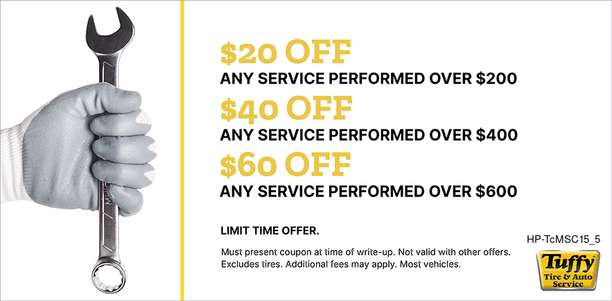 Good only atTuffy St. Johns Expires 07/15/26 Schedule Service Print coupon Share to Google Share to Facebook Share to Yelp Offer details Choose Your Savings $20/$200 $40/$400 $60/$600 * See coupon for exclusions. Email Coupon First name * Last name * Email address * Sign me up to receive future offers via text from Tuffy St. Johns : Via Text Cell/Mobile Phone By clicking "I accept" below, I expressly agree to receive marketing text messages made by or on behalf of Tuffy St. Johns to the telephone number(s) I’ve listed above. I understand that I may receive such text messages by the use of Automatic Telephone Dialing Systems (including “Predictive Dialers” or “Autodialers”) and I agree to receive them even if I have registered my number(s) with my state or federal Do-Not-Call list(s). I understand that such text messages will include advertising containing offers for goods or services and that I may revoke this consent at any time by telephone, return text message or by Visiting tuffystjohns.com/stop to unsubscribe. Message and data rates may apply. I also understand that I am NOT required to provide this consent as a condition of purchasing goods or services. I accept View: Text Specials Terms and Conditions with this link.